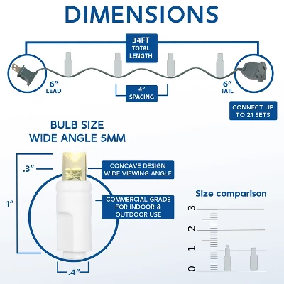 Our super bright whitewire 100 light wide angle mini lights have 100 commercial grade LED bulbs on 4″ centers making each string 34′ long. These strings have non-removable LED’s that eliminates failures from loose, broken, or removed bulbs. These commercial grade LED Christmas lights are very durable, long lasting, and extremely energy efficient. Each string is full wave rectified which eliminates any flickering while making these LED Christmas lights brighter than ordinary LED mini Lights. Each LED uses a patented concave design making these LED viewable from all angles. UL listed for indoor and outdoor use. Connect up to 21 strings end-to-end.